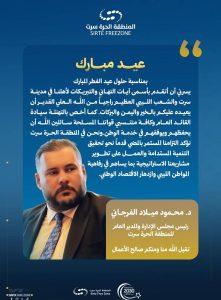 بمناسبة حلول عيد الفطر المبارك يسرني أن أتقدم بأسمى آيات التهاني والتبريكات لأهلنا في مدينة سرت والشعب الليبي العظيم، راجياً من الله العلي القدير أن يعيده عليكم بالخير واليمن والبركات.